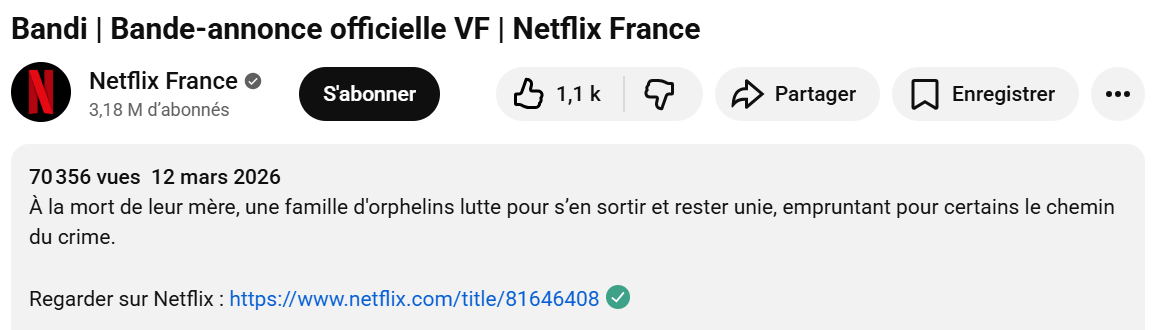 L'historique Netflix que je viens d'établir est axé sur les fictions jeunesse qui est le genre par défaut auquel j'attache Bandi pour le moment à cause du poster et de la bande-annonce… Avant, la série était présentée comme une série de gangsters donc je pensais que ce serait l'histoire d'une fratrie adulte à la “Sopranos”. Surtout à la lecture du communiqué AFP publié en avril 2025…